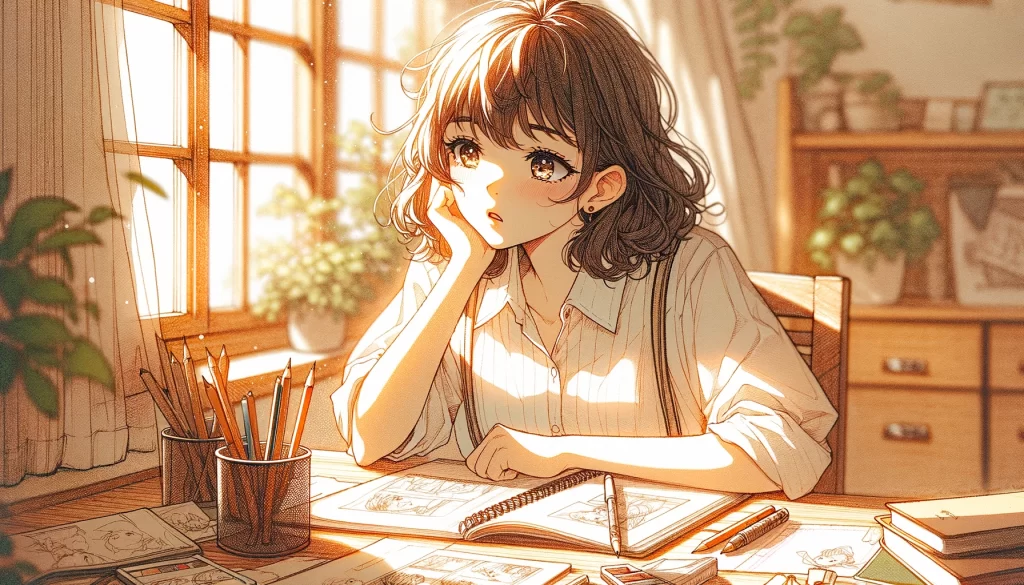A warm-colored pencil-style illustration featuring a beautiful young anime girl character who is sitting in front of a desk, surrounded by sketchbooks and colored pencils scattered around. The room is filled with warm sunlight streaming through a window, showcasing an outside view. Around her, sketches and notes of projects she intends to start are visible. Her expression reflects slight anxiety and a determination to make a decision, amidst the creative chaos of her environment. The scene captures a moment of hesitation in choosing which colored pencil to pick up for her creative endeavor.